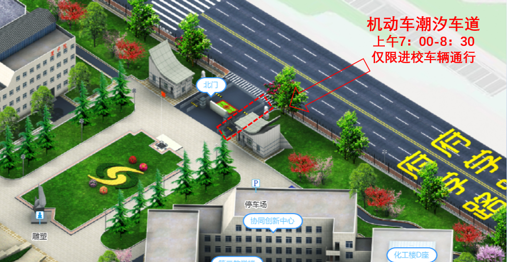为缓解北校园东门早岑岭交通压力,为师生员工驾车入校提供便当。克日起,将北校园北门原无邪车出口更改为无邪车潮汐车道。逐日上午7:00-8:30,潮汐车道仅限进入校园的无邪车通行,出校车辆请走东门;其他时间段,潮汐车道仅限驶离校园的无邪车通行,进校车辆请走东门。