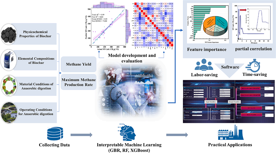 别的,我们开发了基于树的机械学习模子来形貌生物炭特征与厌氧消化之间的重大关系,通过特征可诠释手艺对生物炭对厌氧消化的影响提出了新的看法,并开发一项软件助力生物炭厌氧消化的性能展望(软著号:2022R11L2047794)。相关效果以“Tree-based machine learning model for visualizing complex relationships between biochar properties and anaerobic digestion”为题,于2023年2月在国际着名学术期刊Bioresource Technology上以当期封面论文的形式揭晓。论文链接:https://doi.org/10.1016/j.biortech.2023.128746.