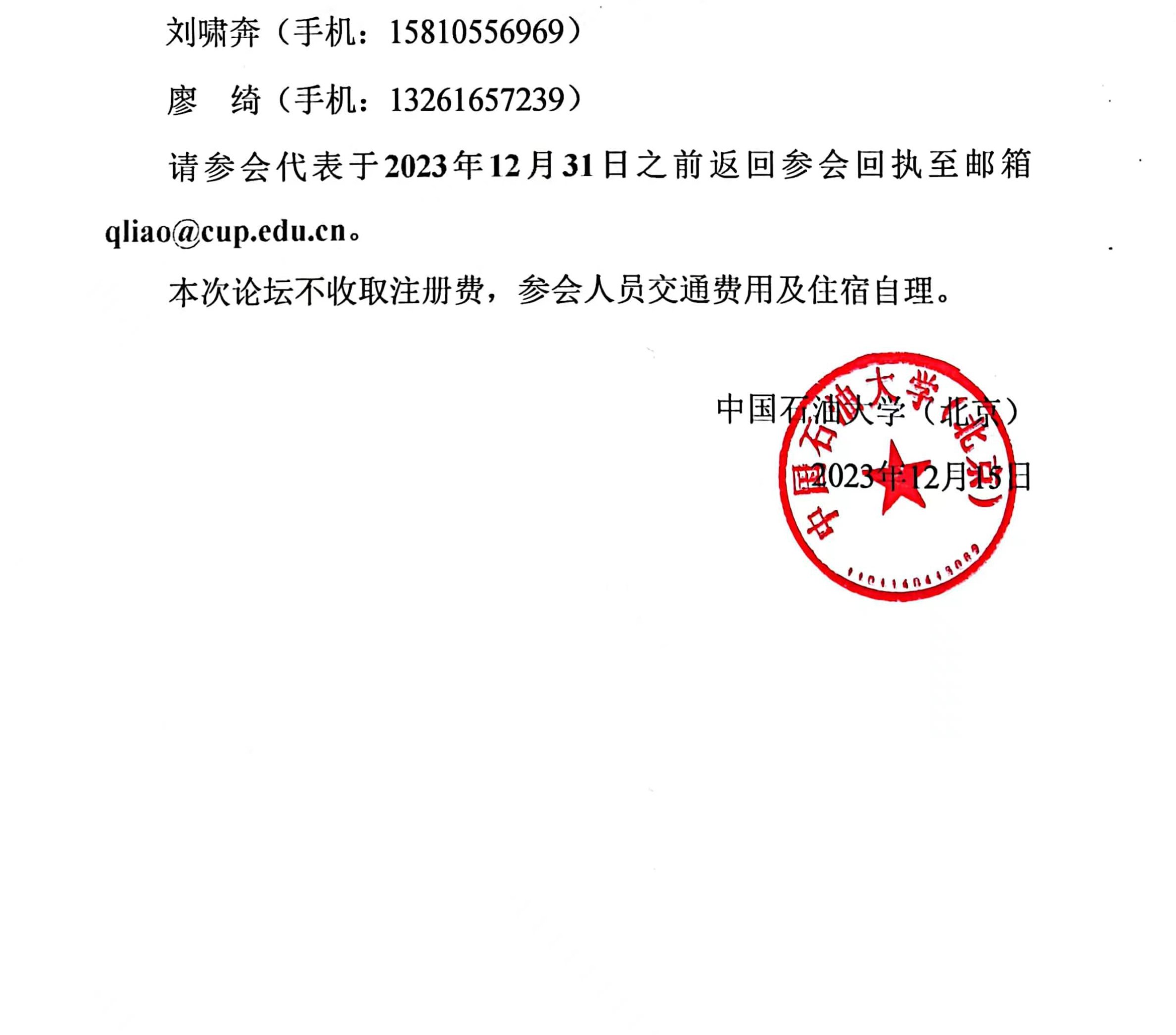 注1:为便于会务组为您提供更周密的效劳,请于2023年12月31日之前发送参会回执至邮箱qliao@cup.edu.cn。