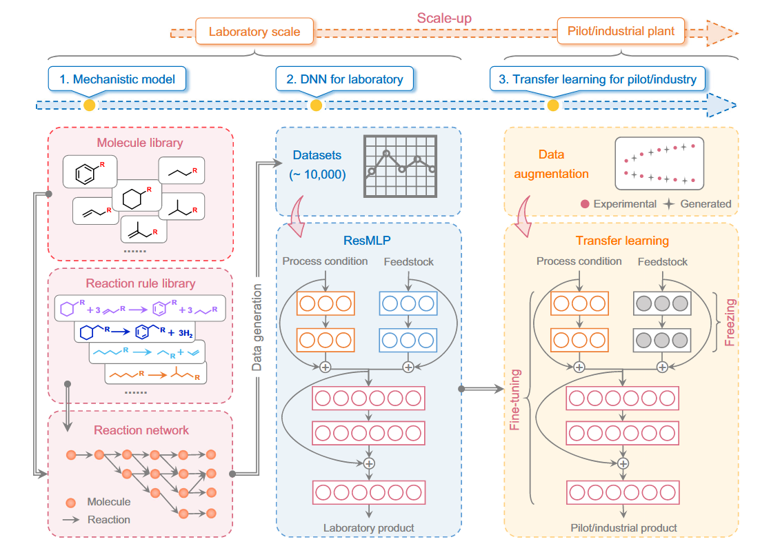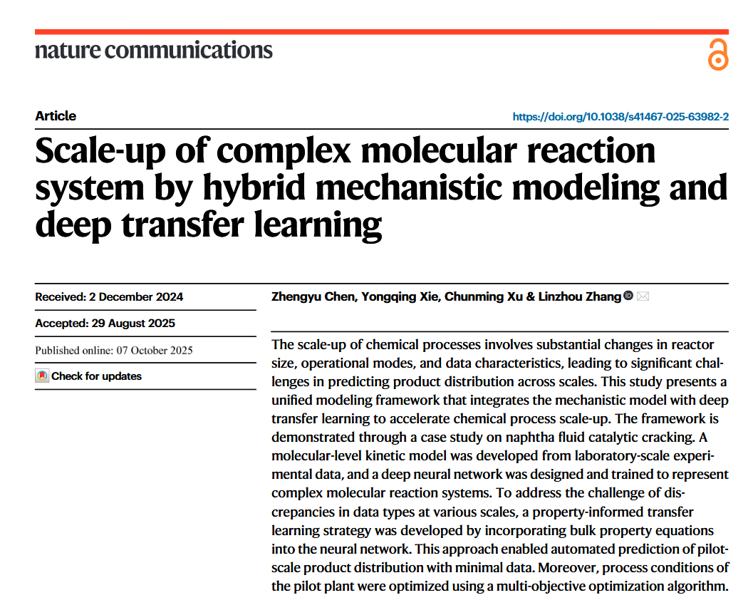 ÂÛÎÄÐÅÏ¢£ºZhengyu Chen, Yongqing Xie, Chunming Xu, Linzhou Zhang*. Scale-up of complex molecular reaction system by hybrid mechanistic modeling and deep transfer learning. Nature Communications 2025,16, 8905.
