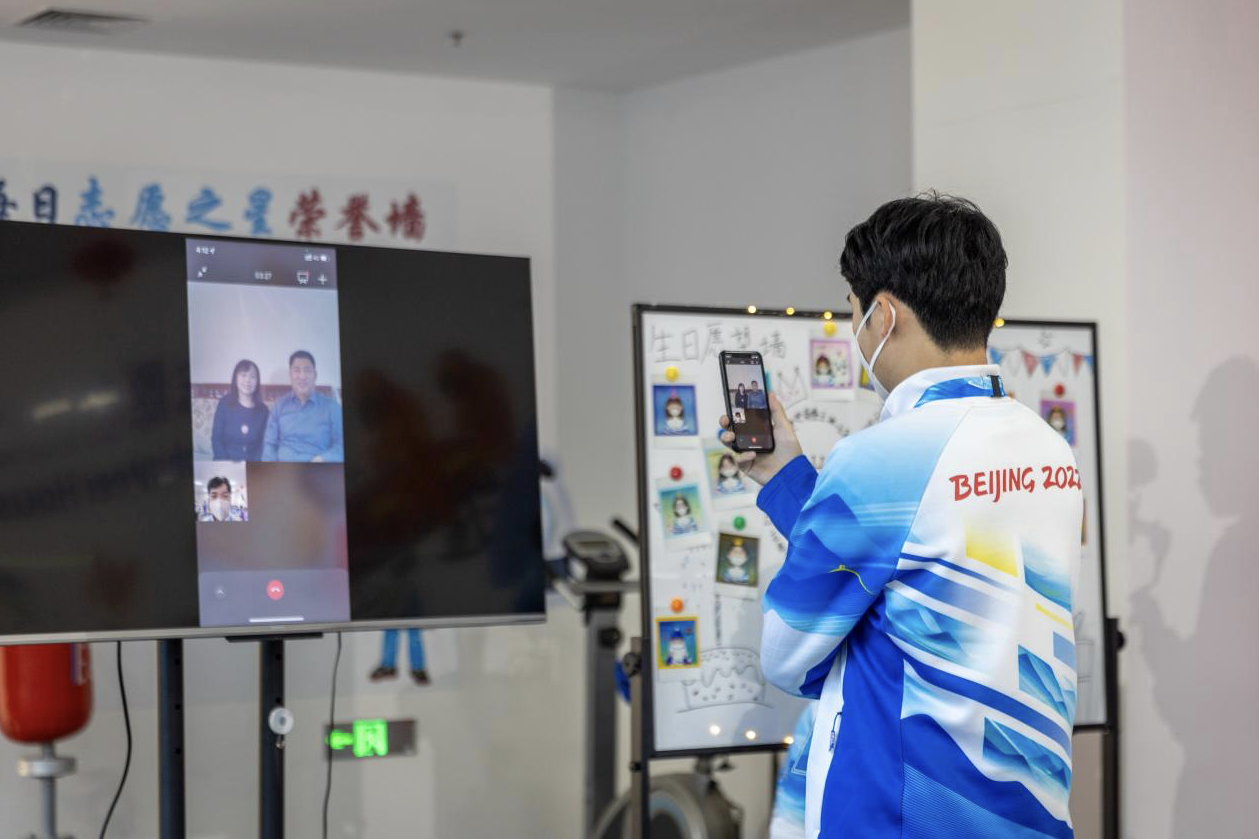 生日会上尚有一个特殊的环节。前期,自愿者团队相识到,自愿者闫雄伟的父亲阎斌是2008年北京冬奥会鸟巢外立面的光照设计师,在整体生日会现场,毗连“两代奥运人”的视频连线开启。