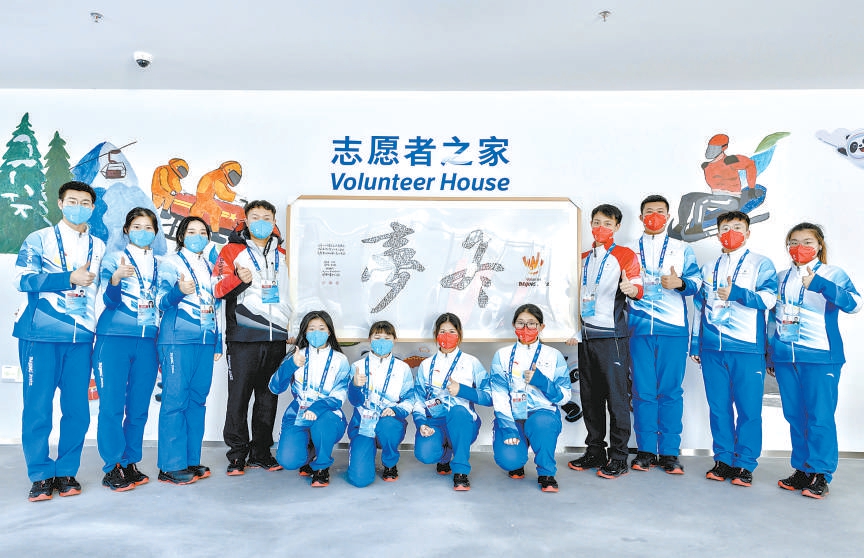 在延庆冬奥村自愿者之家,来自石油大学的自愿者与“冬梦”合影。