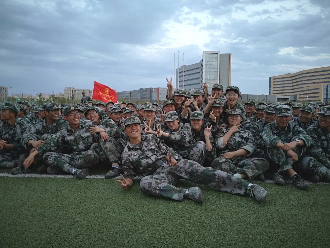 图为张明涵在克拉玛依校区当教官 中心第一排为张明涵