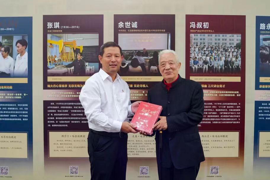 王同奇向余世诚赠予《教育家精神与石油报国》丛书。