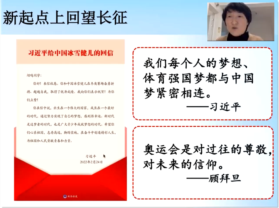 学校马克思主义学院副教授、首批北京高校教书育人“最美课堂”获奖西席余燕飞教学了“冰雪大国的长征路”专题思政课。她连系举行冬奥会的大配景,将党史学习教育贯串始终,从“冰雪奥运长征路”“星火燎原长征路”“走好新时代的长征路”方面,讲述了新时代配景下中国为成为冰雪大国支付的艰辛起劲,并总结了自愿者们在这一届“精彩、清静、简约”的冬奥会中展现的青春继续。